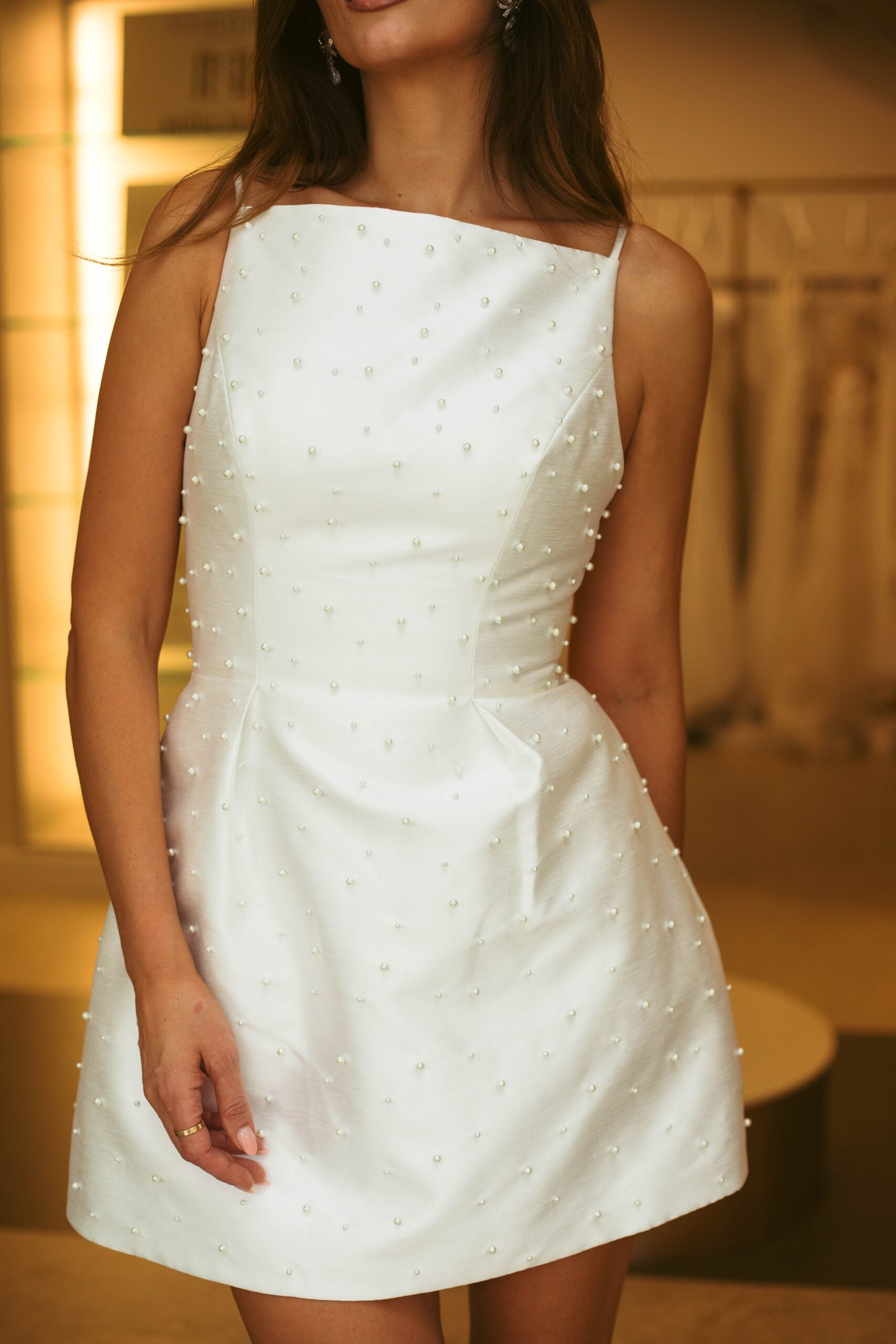 The Hannah mini dress, cut from lustrous taffeta, and dusted in an allover scatter of pearls, is the perfect dress for any bridal occasion. Its' high square neckline adds elegance, complimented by a low back.